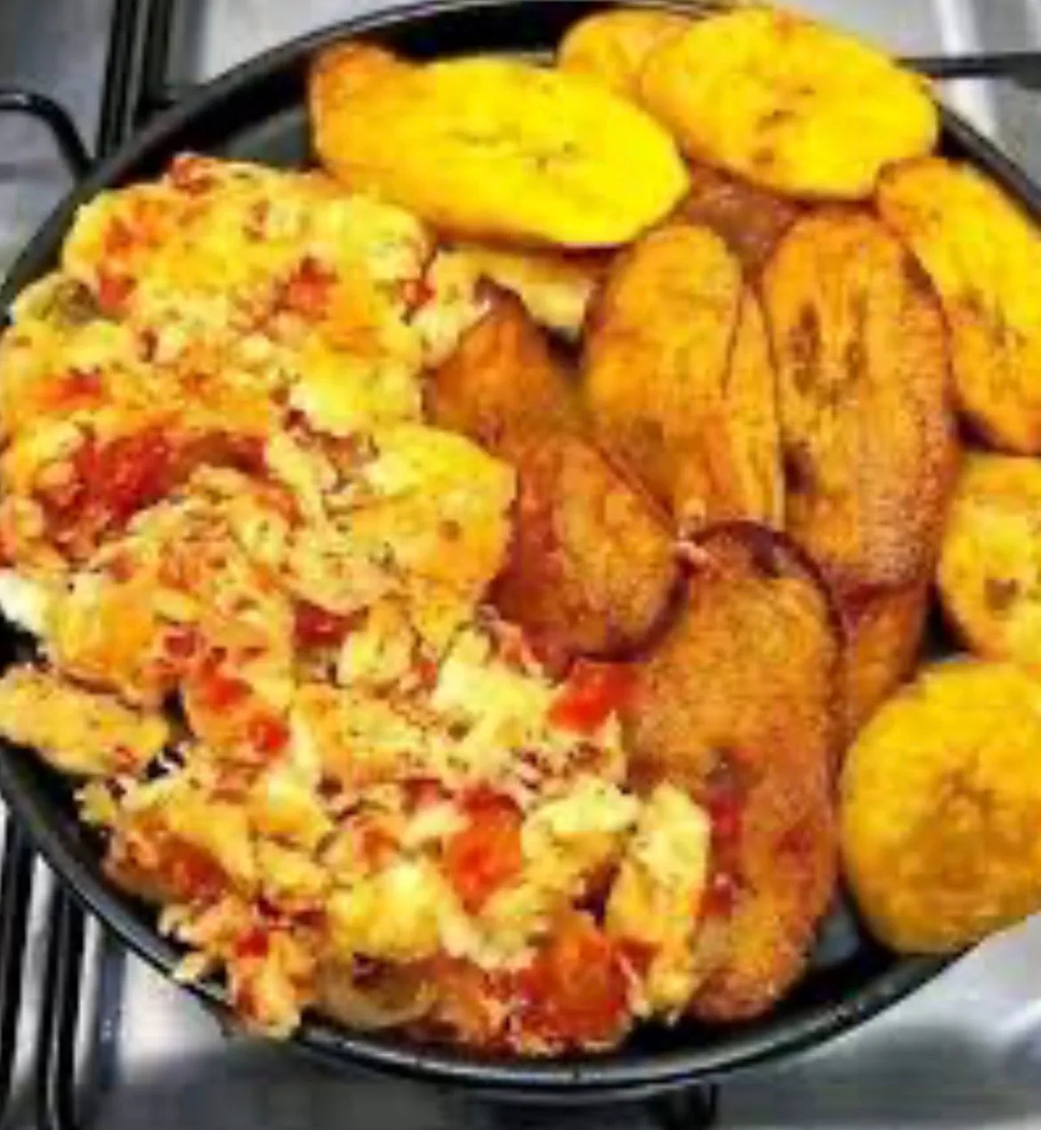 A hearty plate of fried ripe plantains served with a side of spicy, sautéed egg sauce.